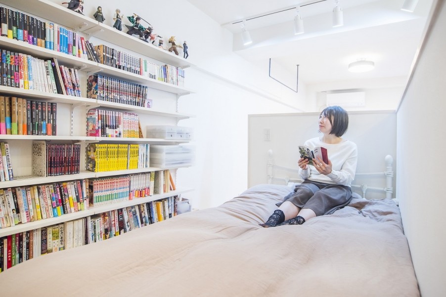 壁一面を有効活用することで大容量の収納スペースを確保でき、お気に入りの本やフィギュアを「見せる収納」や「インテリア」として楽しめるのも嬉しいポイントです。