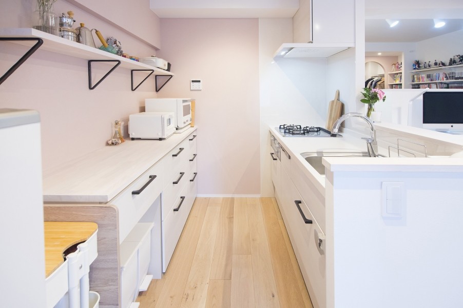 「壁面収納、対面キッチン、洗面台で隣に座れるスペース、パソコンが置けるスペース、ゴルフバッグを置きたい…など、いくつか希望をお伝えしたのですが、最初から希望通りに設計図面が出来上がっていて感動しました。洗面台をリビングに置くという発想はなかったので、とても面白くて新鮮でしたね。キッチンは二人で立っても十分な広さで、料理をしながら椅子を置いて座ることもできます。パソコンの置き場所は、本当に素晴らしい案だなと思いました。設計士さんにアイディアを出していただいて室内の扉を全部取ったのですが、最終的に扉をつけなくて本当に良かったです。ベッドのところは肩までの高さの壁で囲んであり、秘密基地のような空間で壁にもたれて本を読むこともできます。窓際まで座れるソファでくつろいだり、洗面台でTVを観ながら支度ができたり、どこでも落ち着けてポイントが高いんですよね。全体的には狭い方だと思うのですが、余計な空間が一つもないと思います。設計士さんには色々なわがままを申し上げてしまったのですが、毎週打ち合わせをするのは本当に楽しかったです。」(T様)