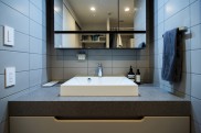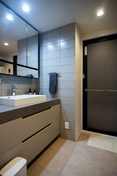 洗面室の壁に使用しているタイルも奥様のセレクトで、正面の一面のみに施すか、左右も合わせて三面に施すかを設計士と相談し、三面に施すことに決定しました。