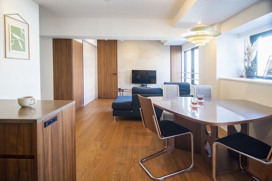 ユナイテッドアローズ社監修のリノベーション物件を気に入っていただきましたが、「細かな部分や色合いを自分たちでこだわりたい」という気持ちが強かったため、マイリノで一から設計をすることになりました。 - 2お気に入りのダイニングテーブルを中心に考えた内装ダイニングに置いているのは、ドイツ・テクタ社の人気ロングセラーのダイニングテーブルです。テクタ社のダイニングテーブルがどうしても欲しかったというK様ご夫妻は、そのダイニングテーブルを置くことを前提に内装を考えていきました。