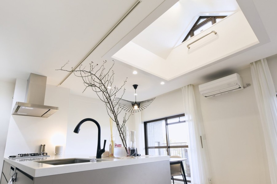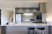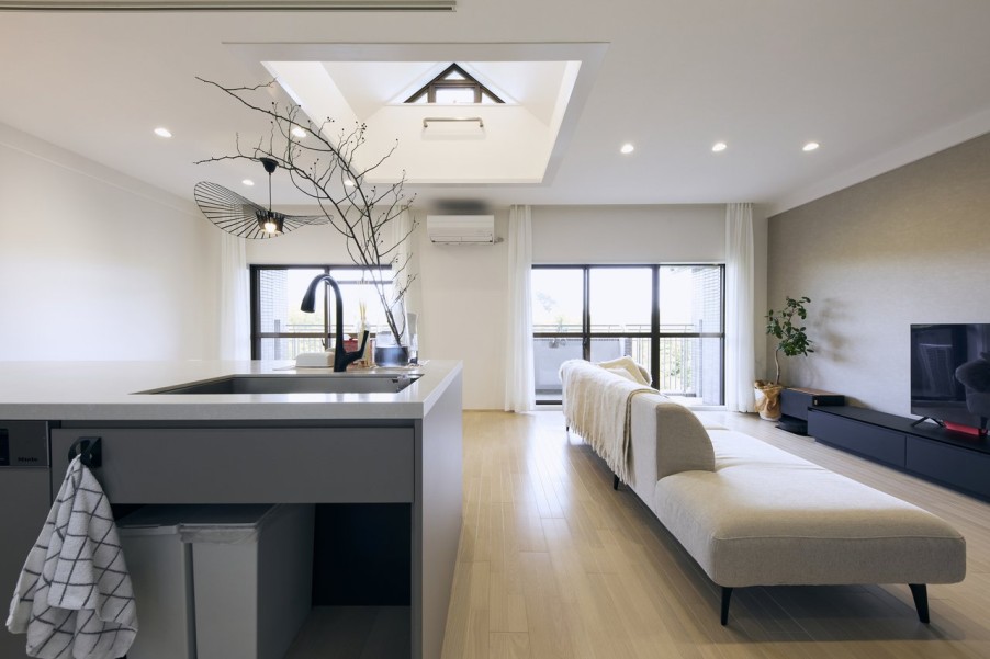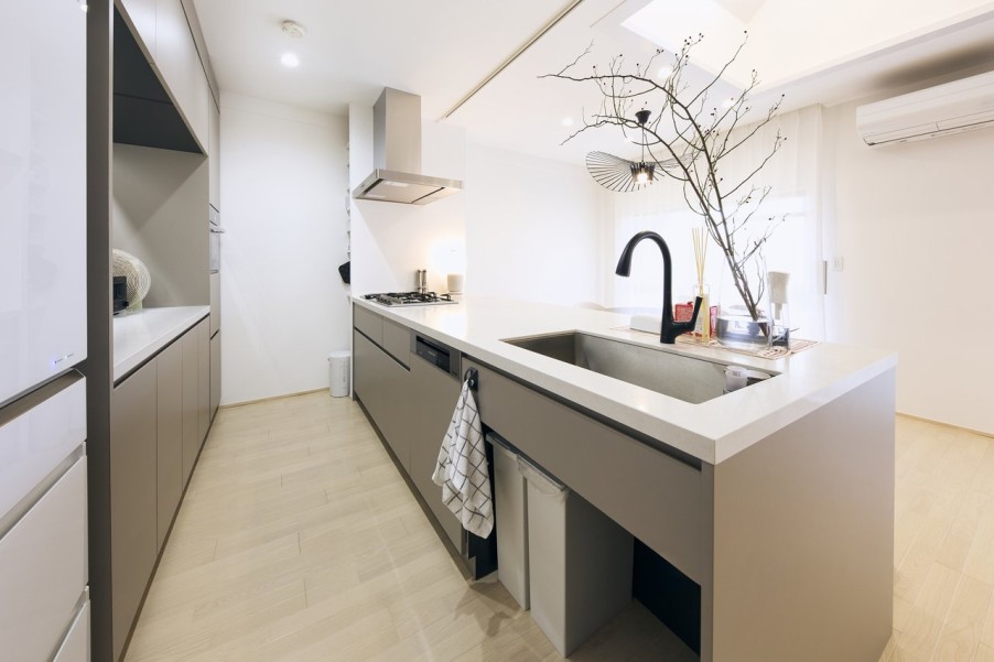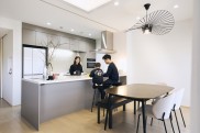 「スーモやホームズを見ていても、なかなか新しい物件情報が出てこず、どうしようかと思っていたところに営業担当の方から『この物件はどうですか?』と連絡をいただきました。そのときは吹田市内の駅近物件を希望していたので、土地勘のない隣の市になってしまうことと、駅から少し距離があることが気になったのですが、一度見てみようと思い内見に来ました。約100㎡近い広さ、眺望の良さ、リビングに吹き抜け、洗面室に屋根裏部屋がある家で面白いと感じ、いつか賃貸や売却するときのことを考えるとこの家だなと思いました。自分が良いなと思ったのと同時に、他の人が見たときにも良いなと思ってもらえる物件だと思い、すぐに申し込みました。」(H様) - 2空間を共有できる、こだわりのキッチン
