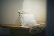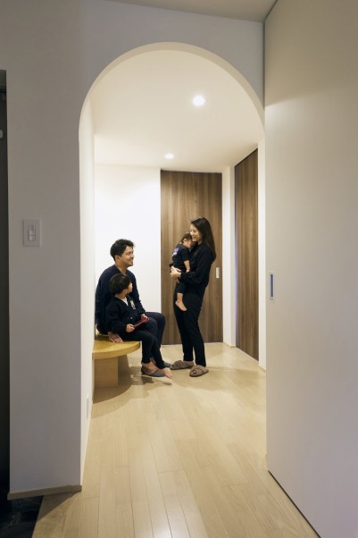 玄関は、床の大理石を既存利用。もともと設置されていたシューズボックスを取り払い、踏込床を造作しました。現在はキャリーケースを置いていますが、将来的には植物とベンチを置きたいと考えているそう。玄関を入って左には、奥様がこだわったアーチの開口があり、奥へ進むと隠れ家のようなヌックがあります。ちょっとした腰掛けとしても、お子さんたちの遊び場としても、ご両親がお泊まりする際の寝室としても使うことができ、床下収納とコンセントも備え付けた便利なスペースです。 - 3理想のインテリアに出会う楽しみ