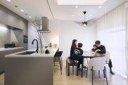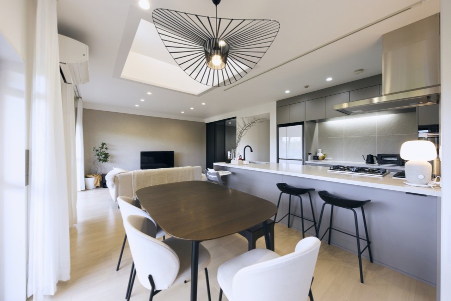 シンプルでありながら温かみのある、ジャパンディスタイルのお住まいが完成。吹き抜けから日の光が降り注ぐリビングダイニングは、家族団らんの場としてはもちろん、ご友人とのホームパーティー、おしゃれなキッチンスタジオとしても大活躍しそうです。人が集い、より一層明るく楽しい時間が流れていくことでしょう。