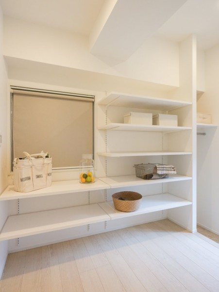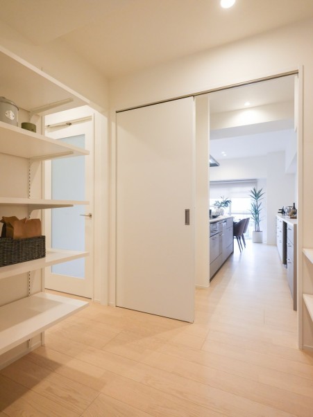 玄関からはホールとパントリー(約2.7帖)につながり、パントリーからはそのままキッチンへ行くことができる回遊性の高い動線設計です。買い物した食材をスムーズにキッチンへ運んだり、通販で届いた日用品をすぐにパントリーへしまうことができます。