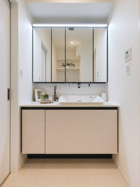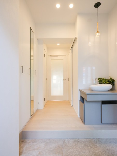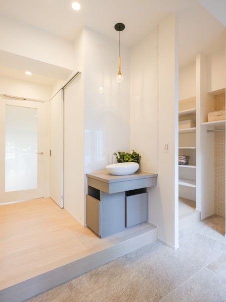 土間スペースには、帰宅後すぐに手を洗えるよう、正面に造作カウンターと手洗いボウルを設置。カウンターの下にダストボックスやペーパータオルなどを収納できるよう設計しました。前面の壁はマグネットボードになっており、メモを貼って家族のコミュニケーションを取れる工夫も。