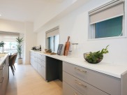 壁付けだったキッチンは、広いシンクと作業台、大容量のフロントオープン食洗機を備えたオープンキッチンに生まれ変わりました。キッチンの壁面には4m超のカップボードを造作しており、収納力も十分です。