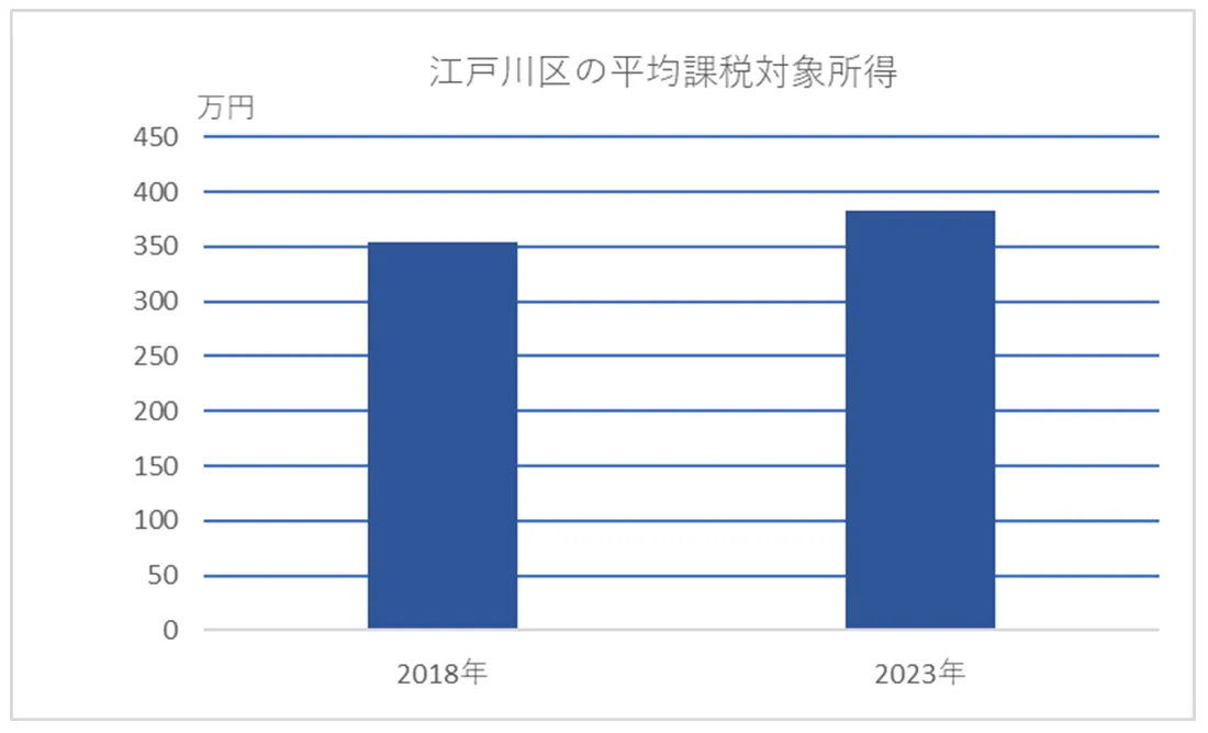 江戸川区の平均課税対象所得は、2018年の353万3,108円から、2023年は30万円程度アップしています。