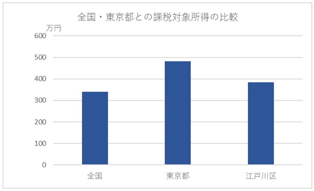 同様の方法で算出した2023年の平均課税所得は、全国は339万7,045円、東京都は481万5,174円です。江戸川区は全国の平均を上回りますが、東京都全体の平均は下回ります。東京23区の中で平均課税対象所得を比較すると江戸川区は20位であり、東京都の中では年収水準が低めです。
