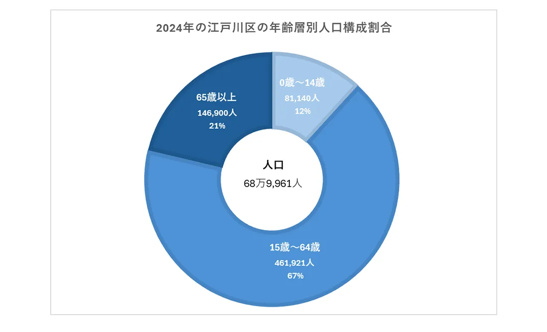 2024年の江戸川区の年齢層別人口構成割合は、年少人口(0〜14歳)は12%、生産年齢人口(15〜64歳)は67%、老齢人口(65歳以上)は21%です。