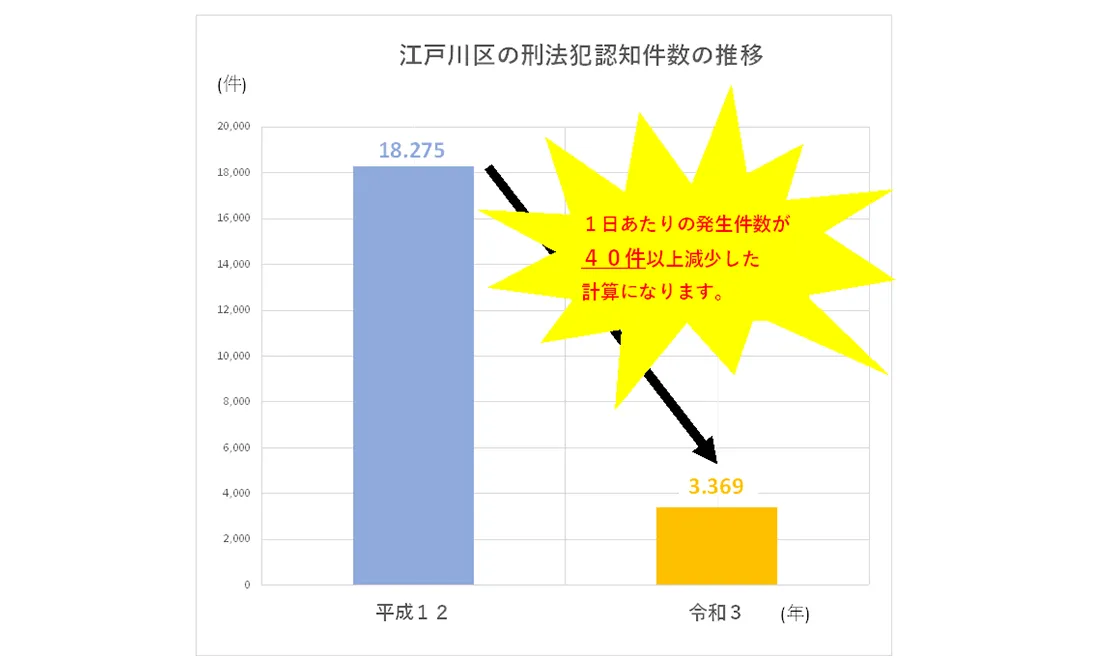 江戸川区は区や地域住民の取り組みによって、治安状況が飛躍的に向上しています。