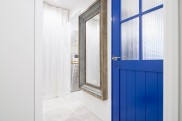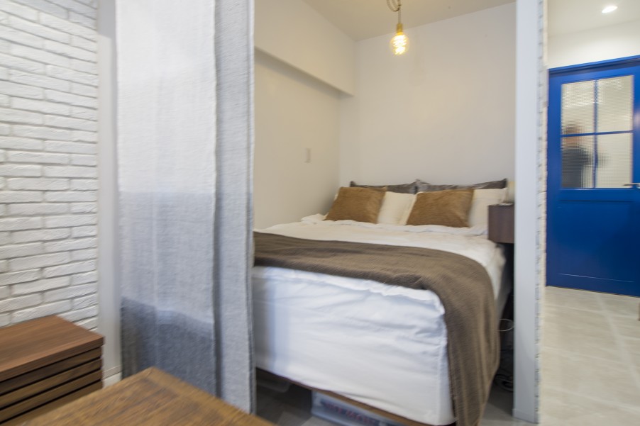 また、アクセントカラーを意識したブルーのドアはご主人のチョイス。さらにカーテンに関してはプロフェッショナルという奥様、寝室との間仕切り、窓にかかったカーテンには麻の布を使っています。