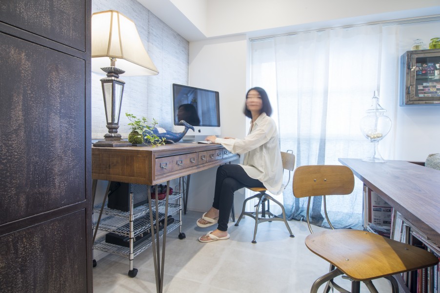 「インダストリアルインテリアが似合う部屋にしたかったので、壁や床は白を基調に、あまり装飾的にせず、シンプルにしました。古木や無垢材を使った家具を置こうと思っていたので、床はフローリングにしないで、白っぽいタイルを選びました。外国の家のような雰囲気になりましたし、こちらは掃除も楽です(笑) 取り入れて良かった部分だと思います」(ご主人)