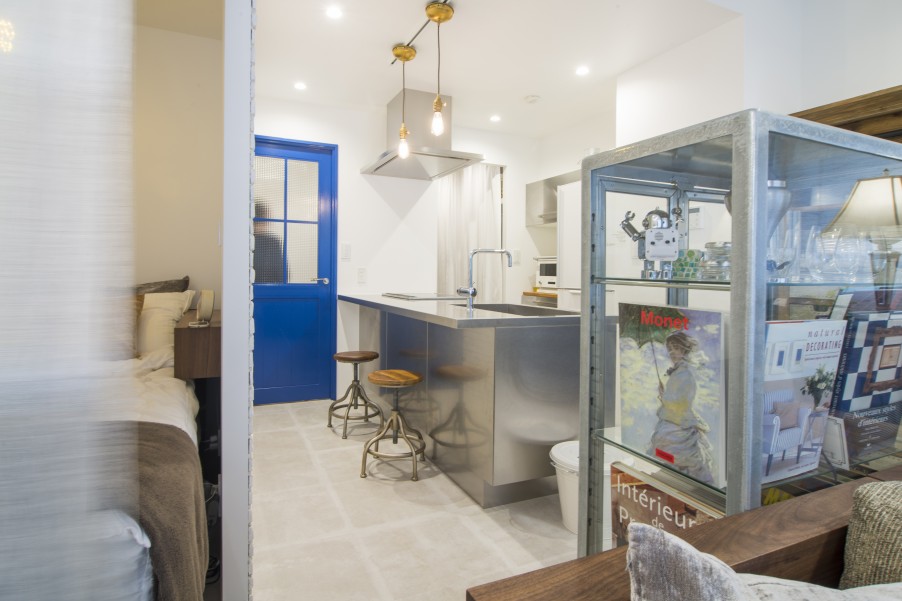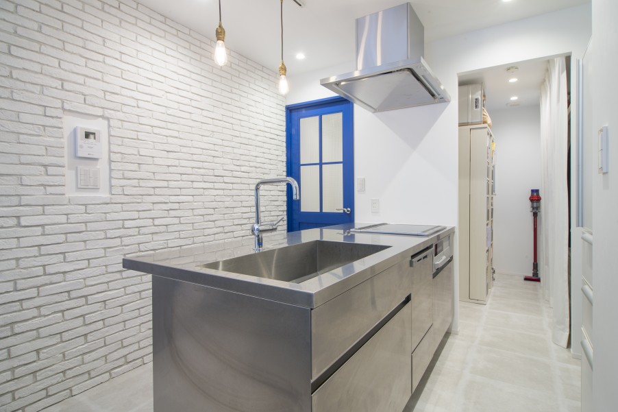 「キッチンです。一般家庭になるようなシステムキッチンは絶対に嫌で、業務用に近いものを希望しました。オールステンレスのキッチンを見つけて、まずはこれをどこに配置するかということから、部屋づくりをスタートしました」(奥様)