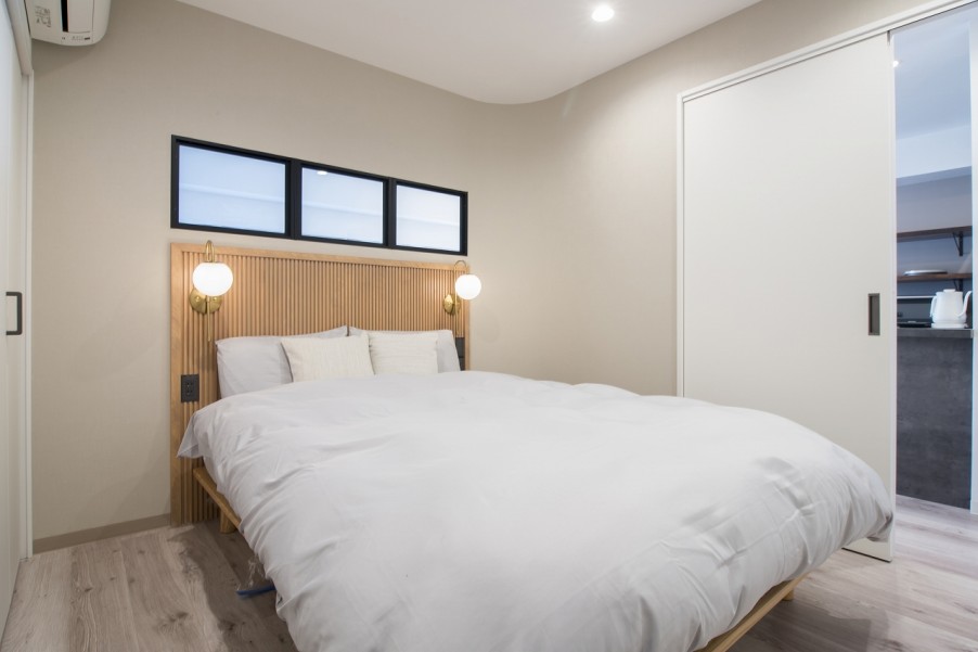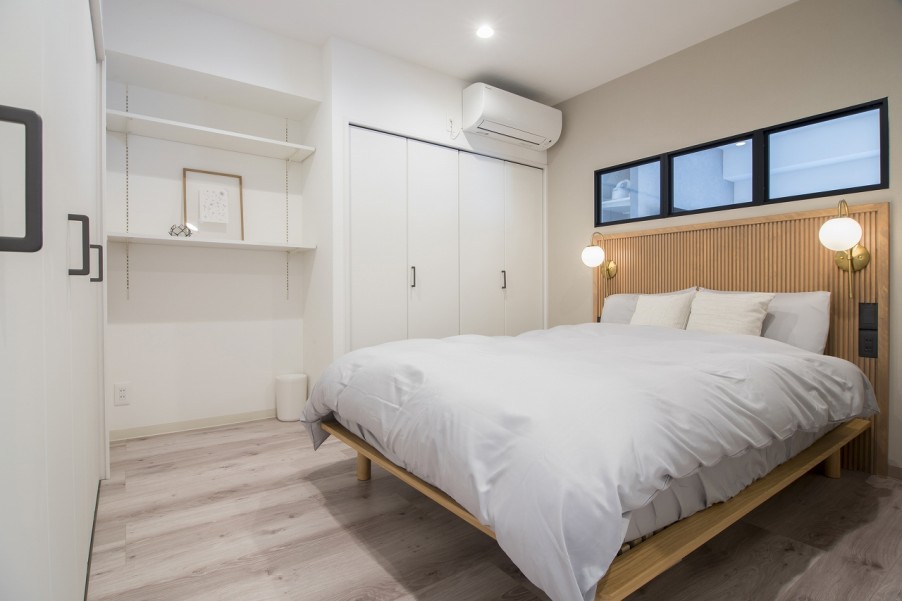 どうしてもはずせないと思ったのは、キッチンとRをつけた壁と室内窓、壁面収納に加え、寝室にベッドのヘッドボードを造りつけることだったと言います。