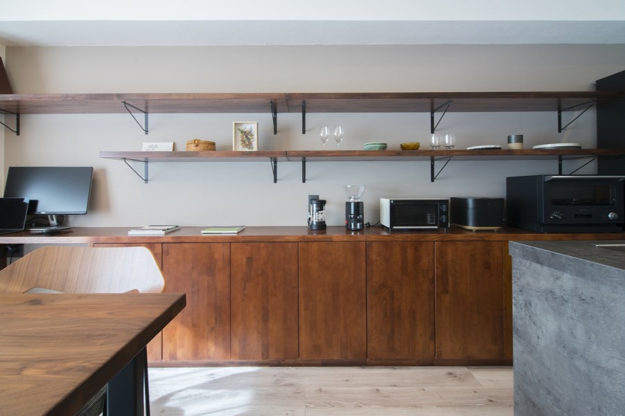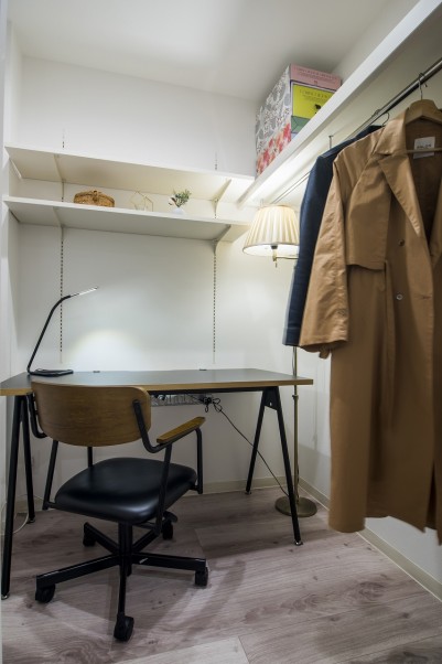 それと寝室のヘッドボードは青山グランドホテルで見て一目惚れした内装を取り入れました(笑)。おかげで自分たちの寝室もホテルのようになって、1ランクアップしたみたいで大満足です」(奥様) - 3たっぷりの収納は機能性も高く、実際の住み心地の良さにも繋がったキッチンの一角には奥様のお仕事スペース。そして、納戸としても使えるスペースがご主人の仕事用の部屋になりました。