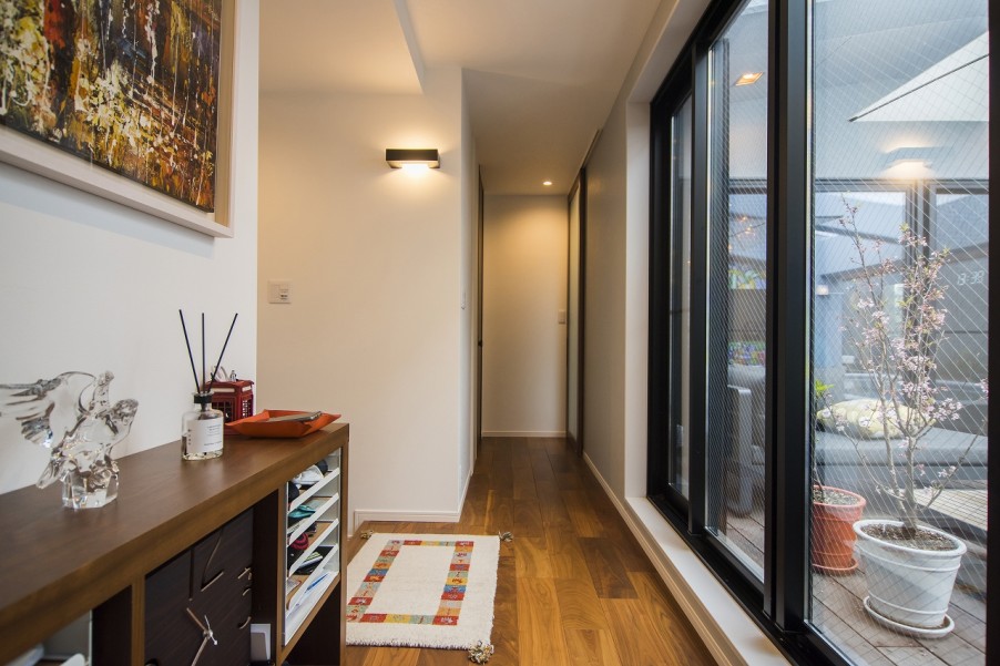 回遊する通路には、途中、段差をつけるなど、変化をつけて、独自のデザインが施されています。また、夜間には自然に照明が灯るなどの工夫も取り入れ、1日中、過ごしたくなる素敵な空間が広がっています。これらはA様のアイデアとのことで、イメージを絵に描いて、それに近い形に表現されていました。