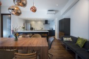 リビングは広さに加えて、ペントハウスの特徴でもある天井の高さが活かされていて、とても開放的です。また、壁の天井に近いところに、テレビが設置されているのも特徴的です。
