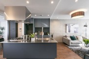LDKの中でも特に目を引くダークグレーのアイランドキッチン、実はリノベーション前は壁付けのL字型キッチンでした。