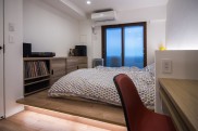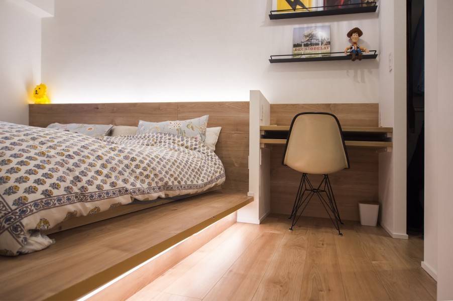 在宅勤務に大活躍している寝室の造作デスク - 3いつか泊まった旅館のような心地よい空間。小上がりを活かした照明やプロジェクションを楽しむお気に入りの場所をお聞きするとご夫婦ともに「寝室!」とのことで、ベッドの正面の壁にプロジェクターを投影し、普段はお子様の大好きなディズニーを流しているといいます。