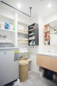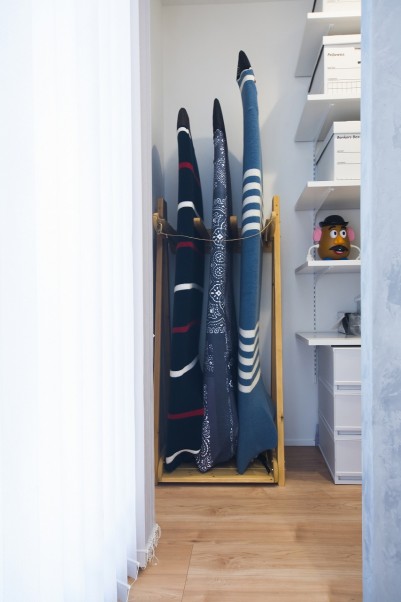 そのほかにも、洗濯機置き場の上部にハンガーをかけられるよう取り付けた黒いハンギングバーや、寝室の扉がないウォークインクローゼット、キッチンのパントリー、テレビ裏の収納スペースも、情報収集によってアイデアを得て採用しました。」(ご主人)