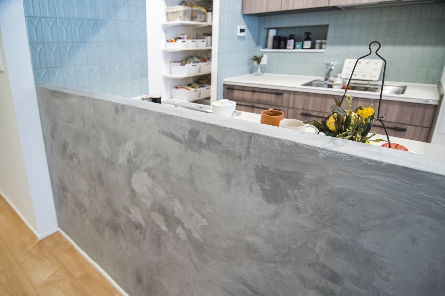 「キッチンの腰壁は、板を貼った状態で置いておいてもらって自分たちで塗装をしました。壁掛けテレビがある壁面も同様の塗装をしています。自分で施工することで思い出が増え、より愛着が湧きました。