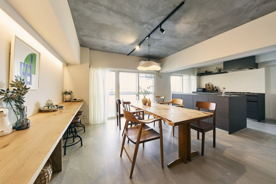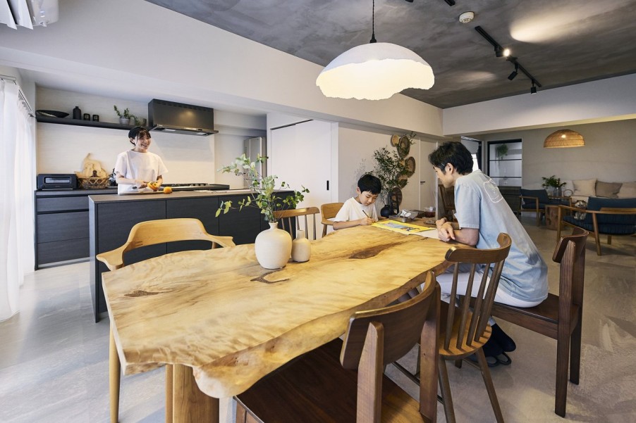 「大きなキッチンが置けることを前提に物件を探していて、広さは80㎡以上を希望していました。他に悩んだ物件もありましたが、立地と広さ、管理状態の良さでこの物件に決めました。前の居住者の方がお掃除を丁寧にされて綺麗に住まわれていて、譲り受けるときは本当にありがたかったです。大切に暮らされていた場所だから、私たちも大切に暮らしていきたいと思いました。」(奥様) - 2桜の木のダイニングテーブルが主役のリノベーション