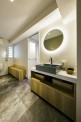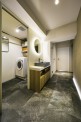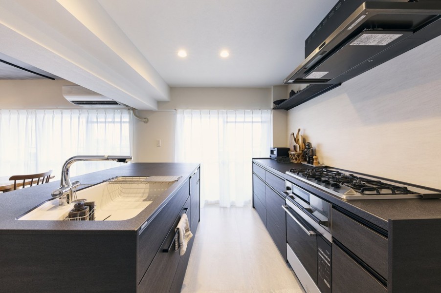 「今までの内見でいろいろなキッチンを見てきましたが、だいたい決まったキッチンの形があって、スペースも限られている印象でした。一日中キッチンに立っていたいくらい料理が好きなので、そこで自分が暮らしていくイメージができず、もっと広いキッチンをつくりたいという気持ちが強かったです。リノベーションでスペースを最大限広く使える二列型キッチンにして、お客さんが来たときに料理やドリンクを並べて取りやすいような広い天板にしています。料理を撮影することが多いので白いキッチンも検討しましたが、このグレーの天板の自然の岩や石のような色に惚れてしまいました。動きやすくて使いやすい最高のキッチンです。」(奥様)