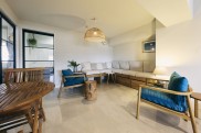「結婚して最初に購入したのが桜の木のダイニングテーブルでした。愛媛県まで探しに行き持って帰ってきたもので、私たち家族のシンボルみたいなものです。もともと『人がたくさん出入りできる家にしたい』と思っていたので、春に人がたくさん集まって花見をするように、このダイニングに人が集まって一年中桜の木を囲むようにしたいと思っていました。木の自然な風合いを活かせるように、ドアや床などの内装はあえてシンプルにしています。リビングの床はテーブルの素材感が活きるよう、一番イメージに近かった、砂漠をモチーフにしたタイルを選びました。」(奥様)