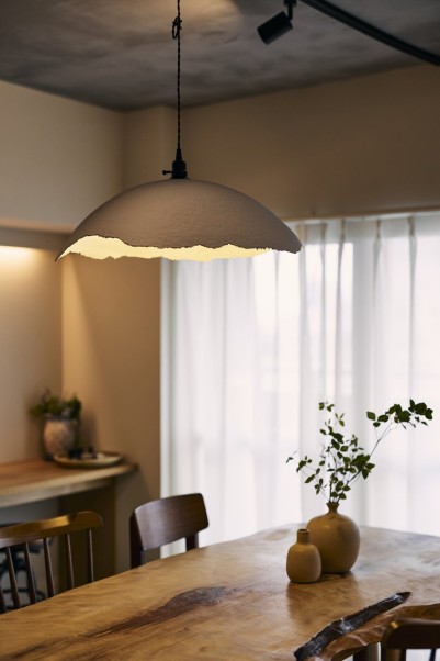 置いている家具や照明にもこだわりが感じられます。ダイニングテーブルの上にある照明はスロバキアの職人がリサイクルペーパーを使用して作ったもの、リビングのソファ側にある照明はハンドメイドのネットショップを通じてオーストラリアから購入したものだそうです。ダイニングとリビングの間の壁際には、奥様がフリマアプリで見つけたベンチが設置され、お知り合いの庭で切った松の木の丸太が置かれています。