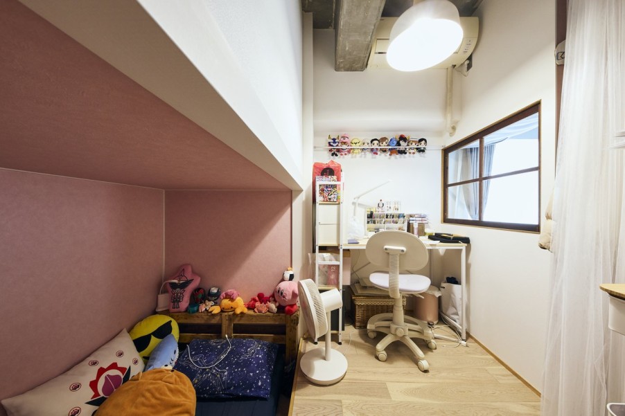 リノベーションでは、娘さんと息子さんそれぞれの部屋とご夫婦の寝室、合わせて3つの部屋を確保することが必須の希望条件だったため、天井高を活かして子ども部屋にロフトをつくり、上段は息子さん、下段は娘さんがそれぞれベッドとして寝られるように設計しています。