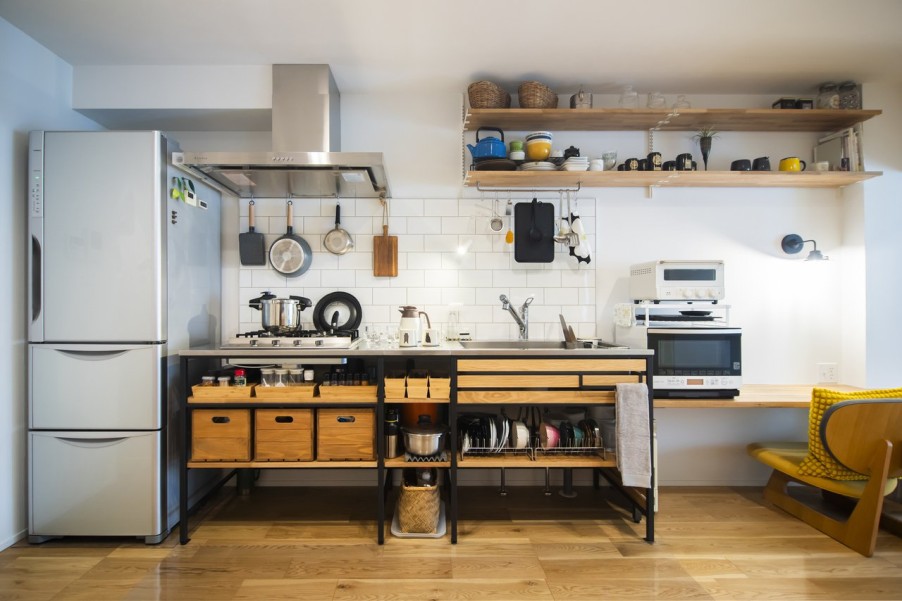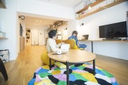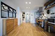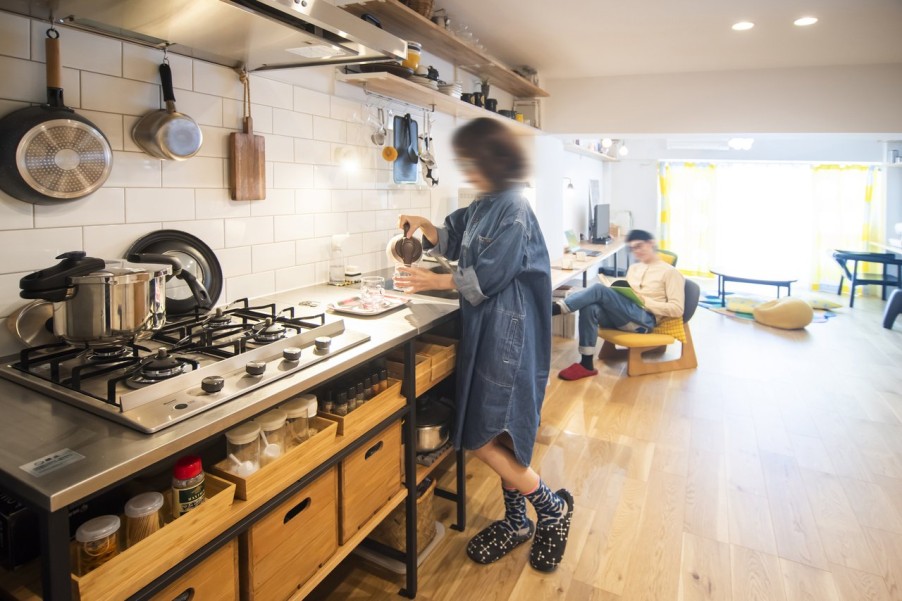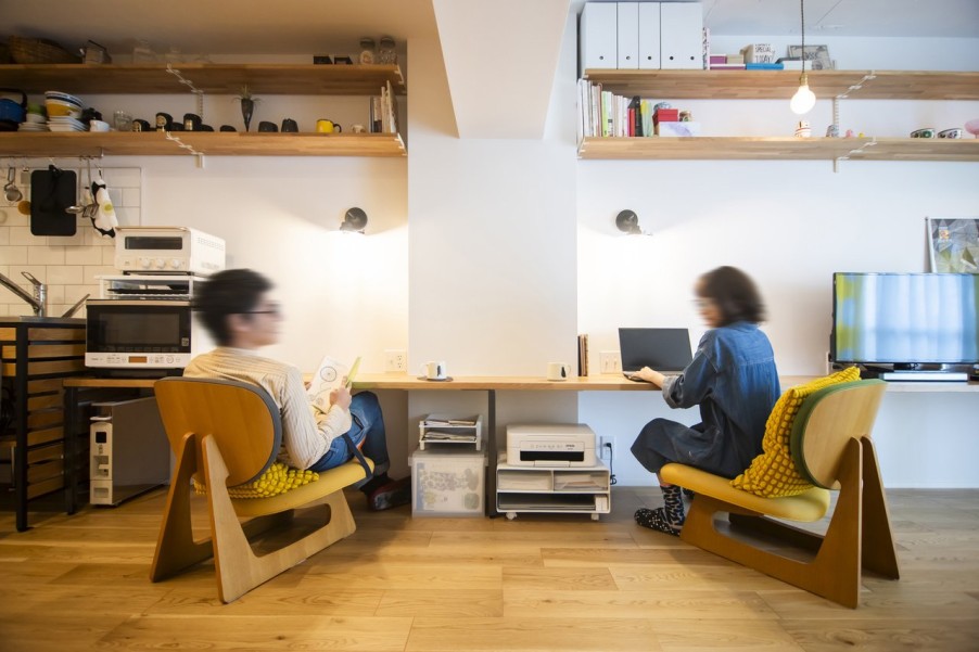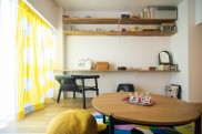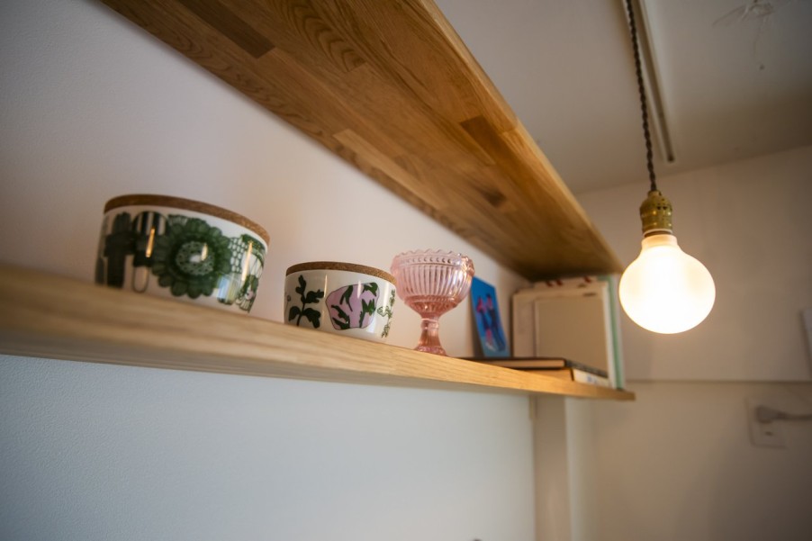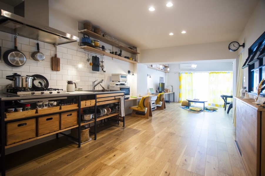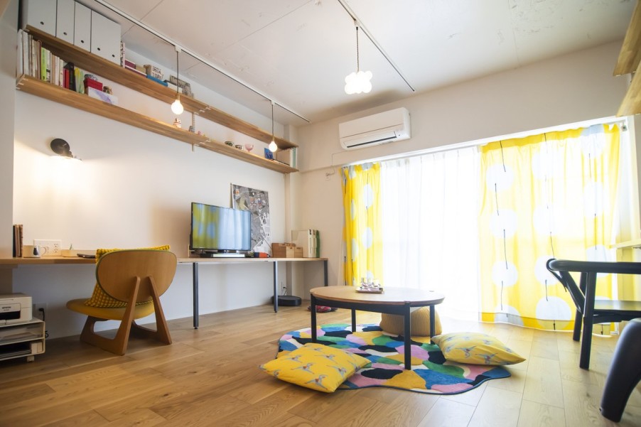 「物件探しでは、品川区、目黒区、大田区、世田谷区を希望エリアとしていました。このマンションは築年数が気になったのですが、営業担当の方が売主側から資料を取り寄せて耐震診断の結果などを確認してくださり、築年数が経っていてもしっかりメンテナンスされていれば大丈夫だと分かり購入を決意しました。共用部には公園のような場所があり、バルコニーからそこの緑が見えたり、周辺環境が静かだったことも決め手になりました。他の不動産会社にも何件か行きましたが、グローバルベイスの営業担当の方は私たちのペースに合わせてご提案してくださったのが印象的でした。物件選びで迷った際には、その物件の懸念点をストレートに教えてくださって、しっかり見極めているのが伝わりました。設計担当の方にお会いした際も、とても話しやすくいろいろなご提案をいただけたので、マイリノでリノベーションすることを決めました。」(ご主人) - 2廊下のない間取りで広々リビングに以前のお住まいでもよくレイアウト変更をしていたこともあり、間取りはライフスタイルの変化に対応できるようシンプルに。リビングの壁面には置くものによって高さを変えたりできる可動棚を取り付け、ワークスペースとしても使えるデスクカウンターはキッチンとデザインを揃えて造作しました。