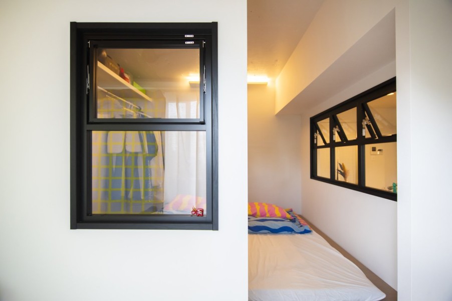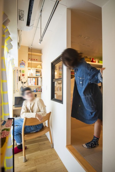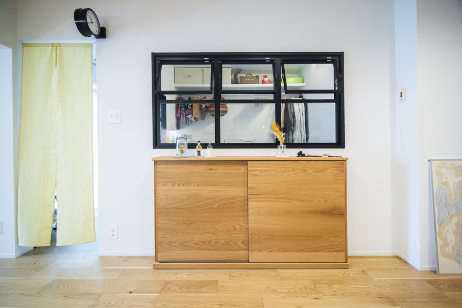 洋室は小上がりになっており、畳をめくると布団や季節家電が入れられる深さの床下収納になっています。リビングから光と風を取り込めるよう、室内窓を2か所に取り付けました。