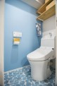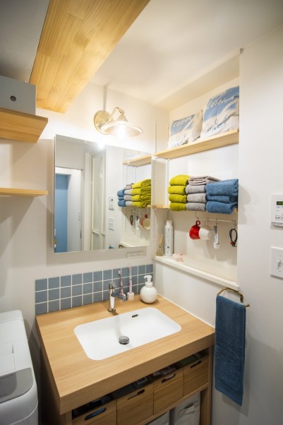 「洗面台は既存利用することも考えましたが、せっかくなら自分たちの好きなようにしたいと思い、メーカーのショールームをいくつか見に行きました。限られた横幅の中に納まってすっきり見えるものが理想だったのですが、既製品ではなかなかピンとくるものがなく、設計担当の方に造作できるメーカーを提案していただきました。鏡の裏は、壁をくり抜いて奥行のある収納スペースになっています。壁に貼っているタイルは、好きなお店にたまたま売っていて一目惚れしたものです。トイレの壁や床もブルー系で統一しました。」(奥様)