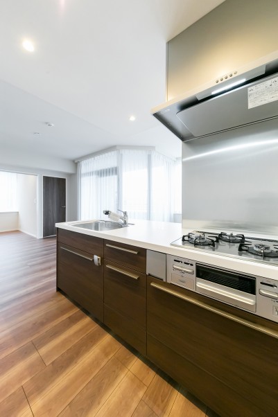 キッチンで分割されていたLDをフラット対面のキッチンを採用することで、一体感のある空間になるようにリノベーションしています。