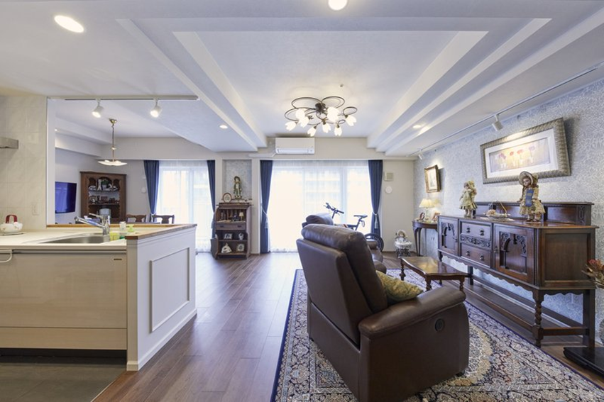 リビングはお手持ちのキャビネットに合わせて、クラシックスタイルの空間にリノベーション。小さい方のキャビネットの上には人形を飾るためのニッチが設けられています。アクセントクロスやモールディングにより、アンティーク家具に合う華やかで格式ある雰囲気が演出されています。