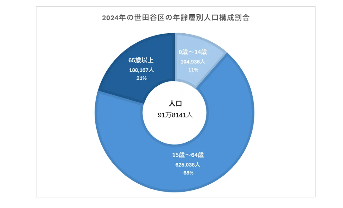 2024年の世田谷区の年齢層別人口構成割合は、年少人口(0〜14歳)11%、生産年齢人口(15〜64歳)68%、老齢人口(65歳以上)21%となっています。