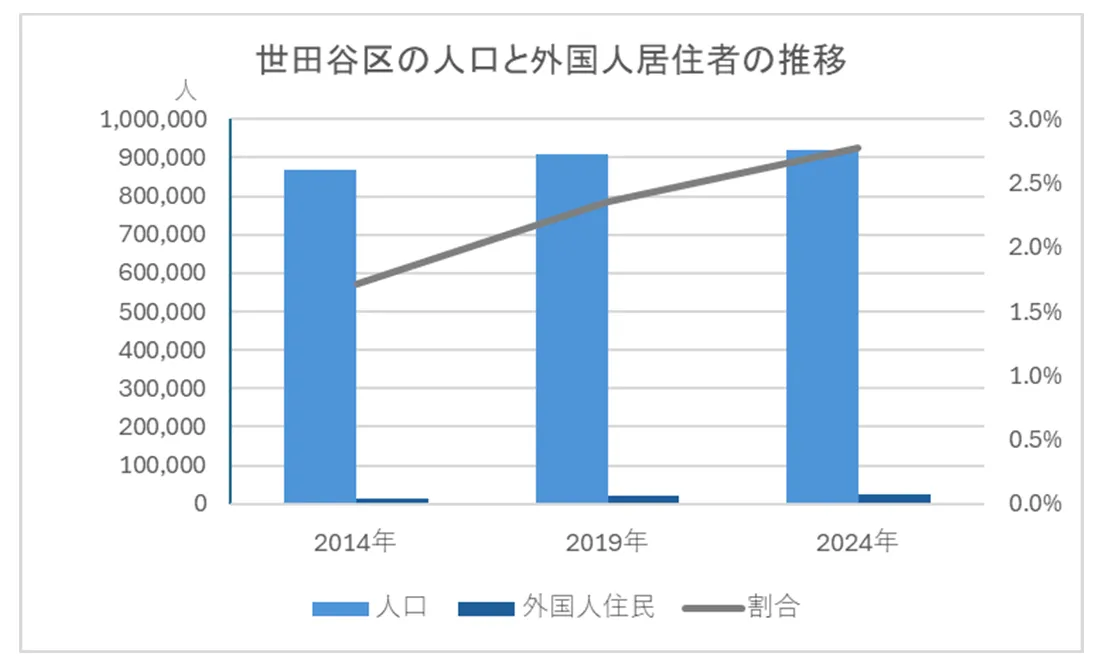 2024年の世田谷区の外国人居住者は2万5,537人で、人口に占める割合は2.8%です。世田谷区の外国人居住者は、2014年の1万4,845人から10年間で1万人程度増えています。また、外国人居住者の占める割合も増加傾向にあります。