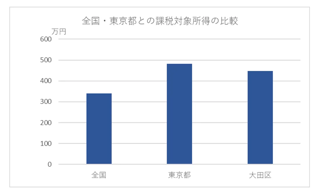 また、2023年の大田区の課税対象所得は、全国の平均339万7,045円を上回りますが、東京都の平均481万5,174円は下回ります。2018年は23区の中で13位でしたが、2023年は15位でした。