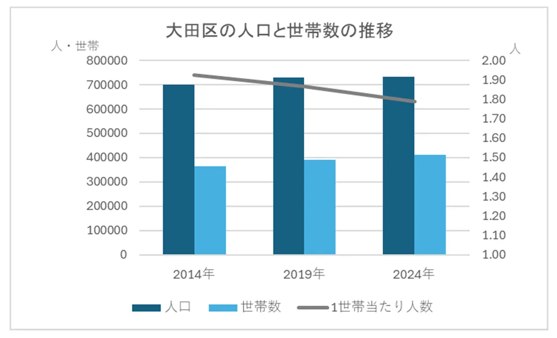 大田区の人口は、2014年は70万1416人、2019年は72万9,534人であったことから、ここ10年で緩やかに人口が増加しています。一方で一世帯あたりの人数は、2014年は1.92 人、2019年は1.87人、2024年は1.79人と減少傾向にあり、単身世帯が増えていることが推測されます。