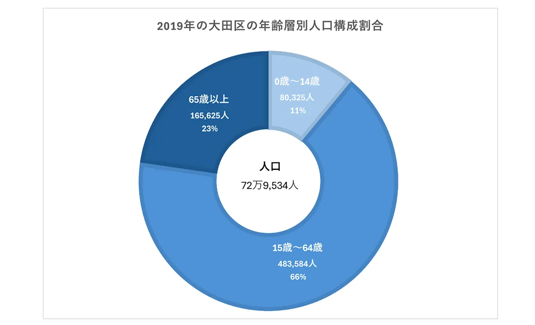東京都全体のデータは、年少人口(0〜14歳)11%、生産年齢人口(15〜64歳)66%、老齢人口(65歳以上)23%で、同程度の割合です。全国のデータは年少人口(0〜14歳)12%、生産年齢人口(15〜64歳)60%、老齢人口(65歳以上)29%となっており、大田区や東京都は老齢人口の割合が低いといえます。
