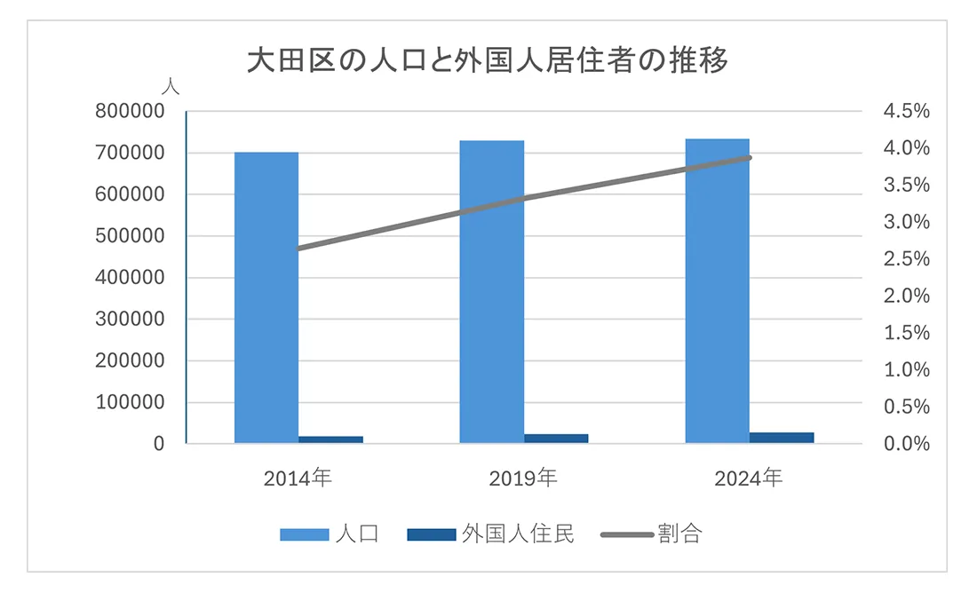 2024年の大田区の外国人居住者は2万8,397人で、人口に占める割合は3.9%です。外国人居住者は2014年は1万8,545人で2.6%、2019年は2万4,199人で3.3%であったことから、緩やかに増加しています。