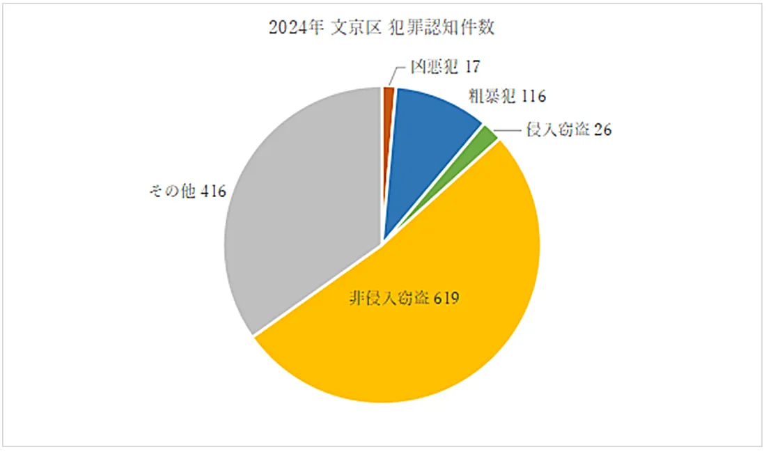 警視庁発表の「区市町村の町丁別、罪種別及び手口別認知件数」によると、2024年(令和6年)に東京都文京区で発生した犯罪は1,194件。犯罪の内訳は下表の通りでした。