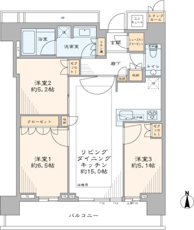 東京メトロ有楽町線・都営大江戸線『月島』駅徒歩14分 - 間取り : 3LDK+SIC・TR