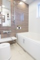 - 3家族の人数が多くても使いやすそうな工夫75m2弱の物件は大きな間取り変更はしていないのですが、家族の人数が多くても使いやすそうな工夫も感じられます。例えば、朝の忙しい時でも、みんなで身支度をスムーズに洗面所は横一列に並んで使えるように、棚の部分が横長になっています。