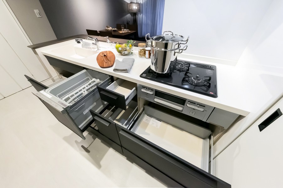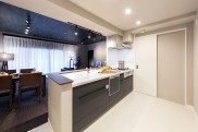 畳側から部屋に入れる様にと“縁側"側へも畳を横切らず、通れるように入口を2つ設けて動線を2WAYにしました。 - 2ひろびろ4LDKキッチンには何でもしまえるパントリーを設置。キッチンは2方向から入れるようになっており動線の良い間取りになるように考慮しました。
