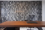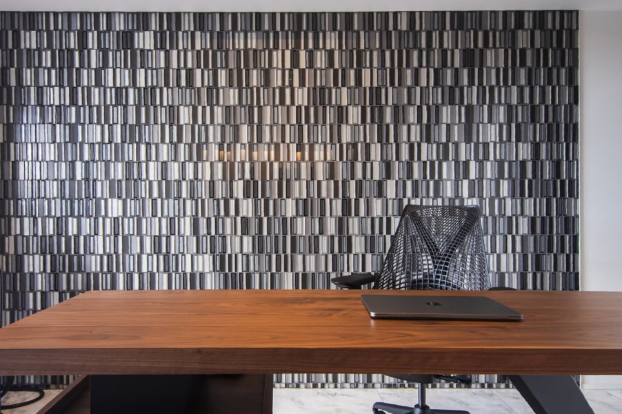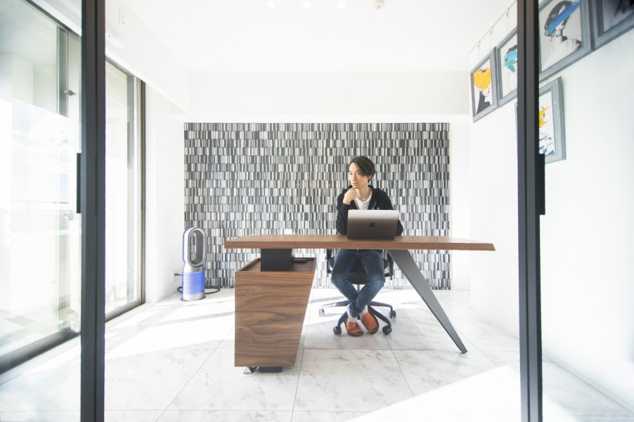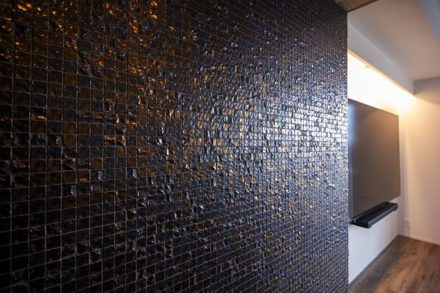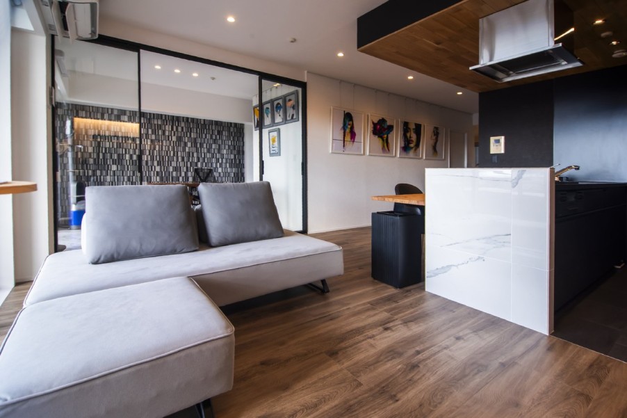 「いろいろなリノベーション事例を見る中で、別空間と思えるようなワークスペースをつくりたい、と思っていました」と話すY様。ワークスペースは設計担当からの提案で天井いっぱいの高さがあるガラス引き戸を採用し、キッチン側からワークスペースを見たとき、まるでショーウインドウを見ているかのような空間になるように設計しました。ガラス引き戸にしたことで、デスクからリビング全体を見渡せるため、リモちゃんを見守りながら仕事をすることができます。ワークスペースの壁面には、イタリア製のガラスタイルをアクセントウォールとして施工し、部屋の奥には仕事関連のものを収納できるスペースを設けました。ワークスペースとリビングの床の境目は床材を変えてゾーニングしており、ガラス引き戸を開放すればリビングの延長としても使うことができます。