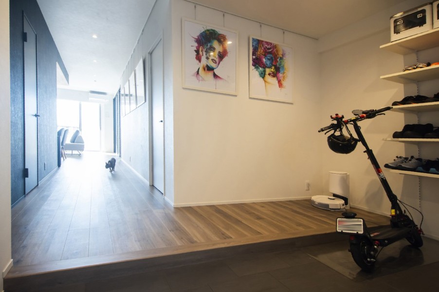 もともとコンパクトだった玄関は、電動キックボード置き場と充電場所の確保をしつつ、リモちゃんのトイレや爪とぎを置くこともできる、ゆとりのあるスペースに生まれ変わりました。玄関ホールからリビングへ続く廊下は、あえてドアを取り付けず開放的な空間に、壁面には以前から収集されているアートを飾れるようにピクチャーレールを設置しました。