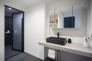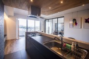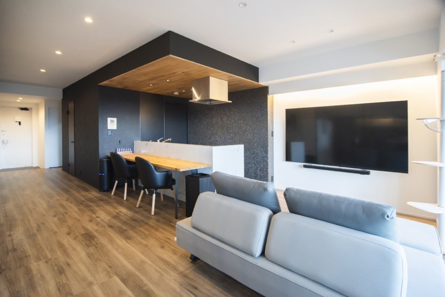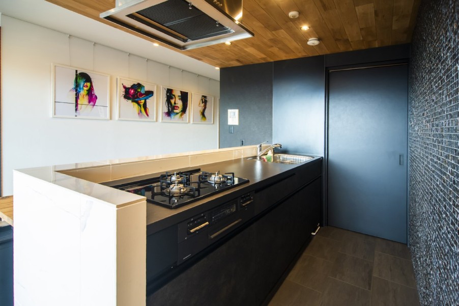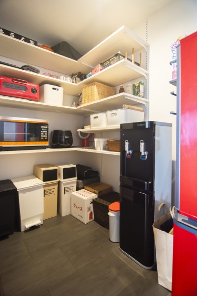 「できるだけ生活感をなくしたい」というご希望から、キッチンの奥にパントリーを新設し、冷蔵庫や調理家電、ウォーターサーバーを全て収納できるように設計しています。ワークスペース側からの見栄えにもこだわり、キッチンスペースの壁面には磁器質タイルを、天井にはフローリング材をアクセントとして施工しました。キッチン前面の腰壁は、壁面の黒い磁器質タイルとの色のメリハリが生まれるように、白い磁器質タイルで仕上げています。
