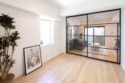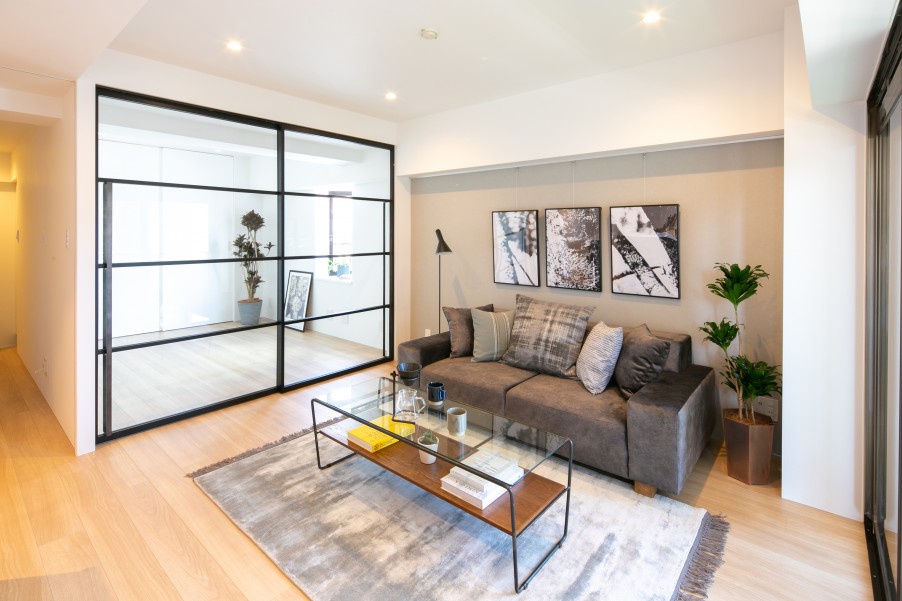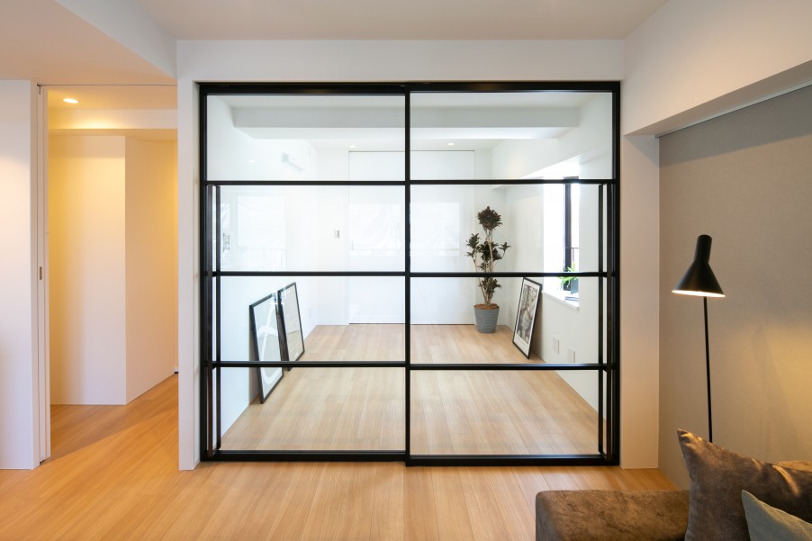 リビングと寝室を分ける黒枠とガラスで制作したオリジナルの建具はゆったりとしたひとつの統一空間を演出するとともに、洗練された印象を作り出します。