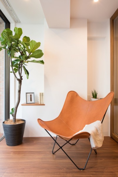 白い壁と引き立て役のブラウンの絶妙なバランスが空間の美しさをより一層引き立てます。
